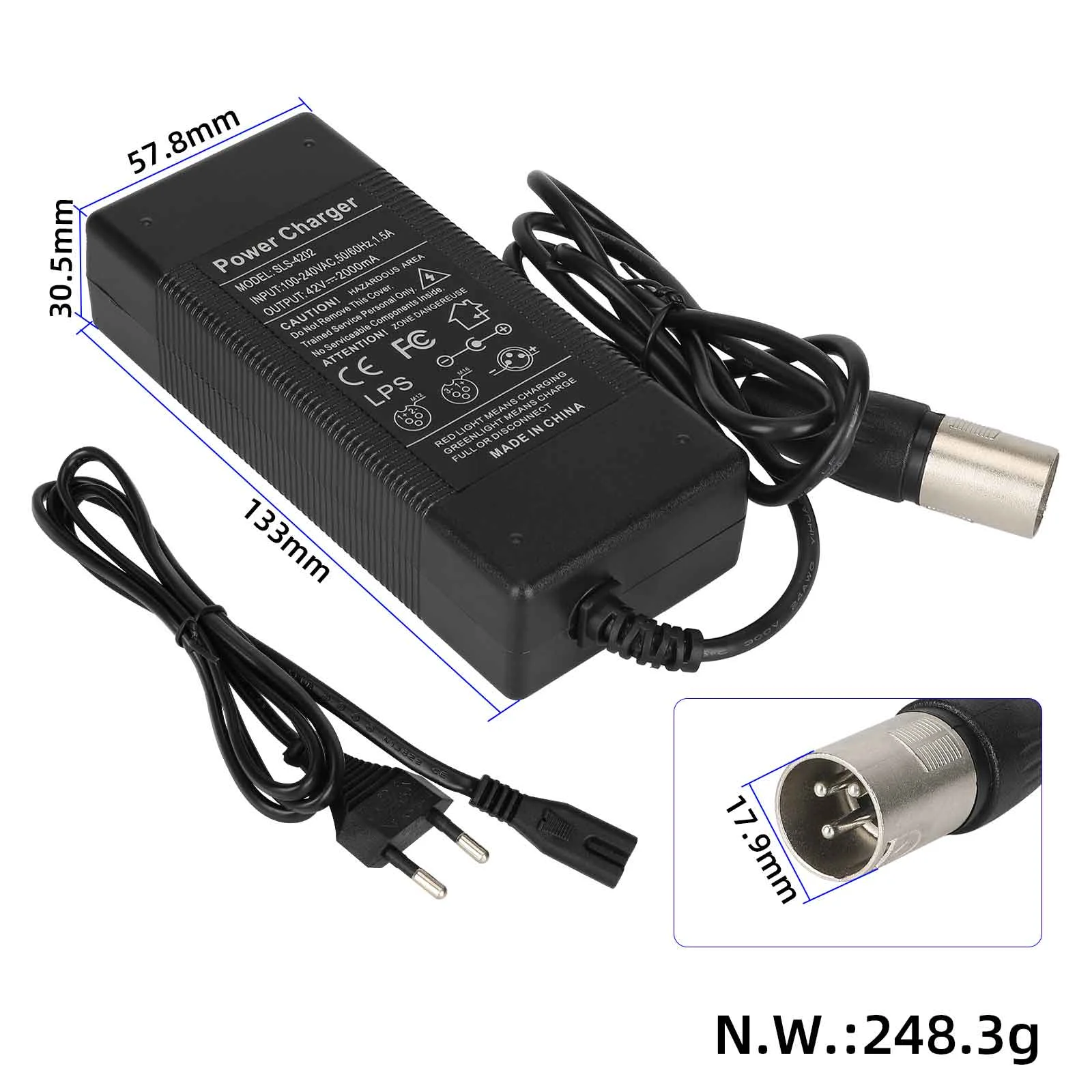 Denna 36V / 42V 2A XLR-laddare ger effektiv laddning för alla 36V litiumbatterier –